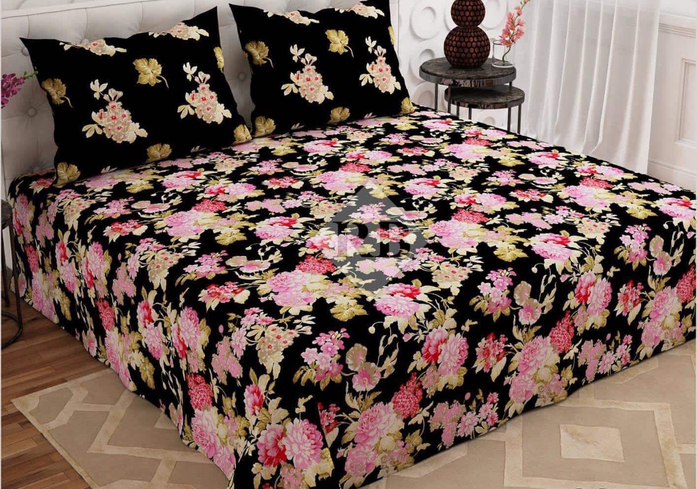 Black Pure Cotton Bedsheets, bring elegance and charm to your bedroom with the SleepEase , featuring a classy black base adorned with delicate pink flowers.