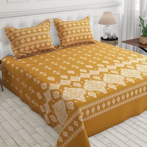 Mustard pure cotton bedsheets that bring cozy sophistication to your bedroom with the SleepEase , featuring a rich mustard base beautifully detailed with elegant white patterns.