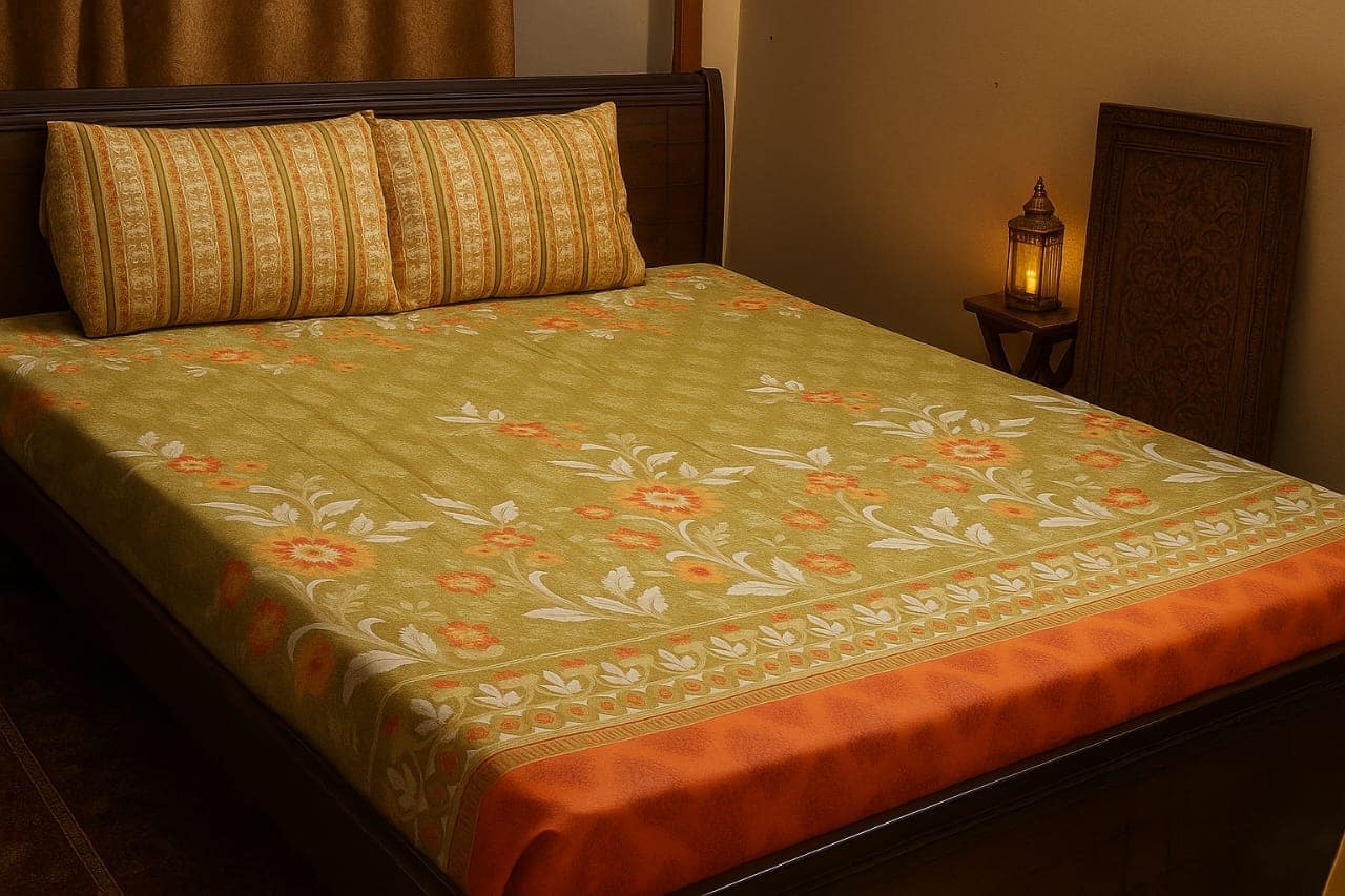 Bring a calm, refreshing vibe to your room with this Soft Cotton Bedsheets in a light green tea shade beautifully blended with orange floral patterns. Crafted from a premium soft cotton mix, it offers the perfect balance of smooth comfort, durability, and breathability, keeping you cozy in every season.